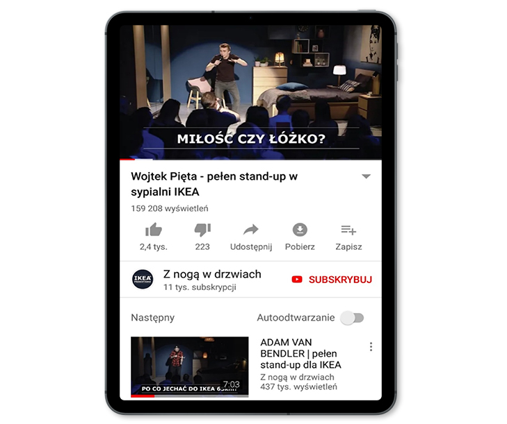 Sypialnia bez tajemnic? W satyrycznej kampanii dla IKEA prawdziwe sypialnianie historie opowiadali stand-uperzy. Nagrania w sypialni, na żywo, z udziałem publiczności były głównym elementem kampanii w internecie. Filmy emitowane były na kanale YouTube „IKEA. Z nogą w drzwiach”.